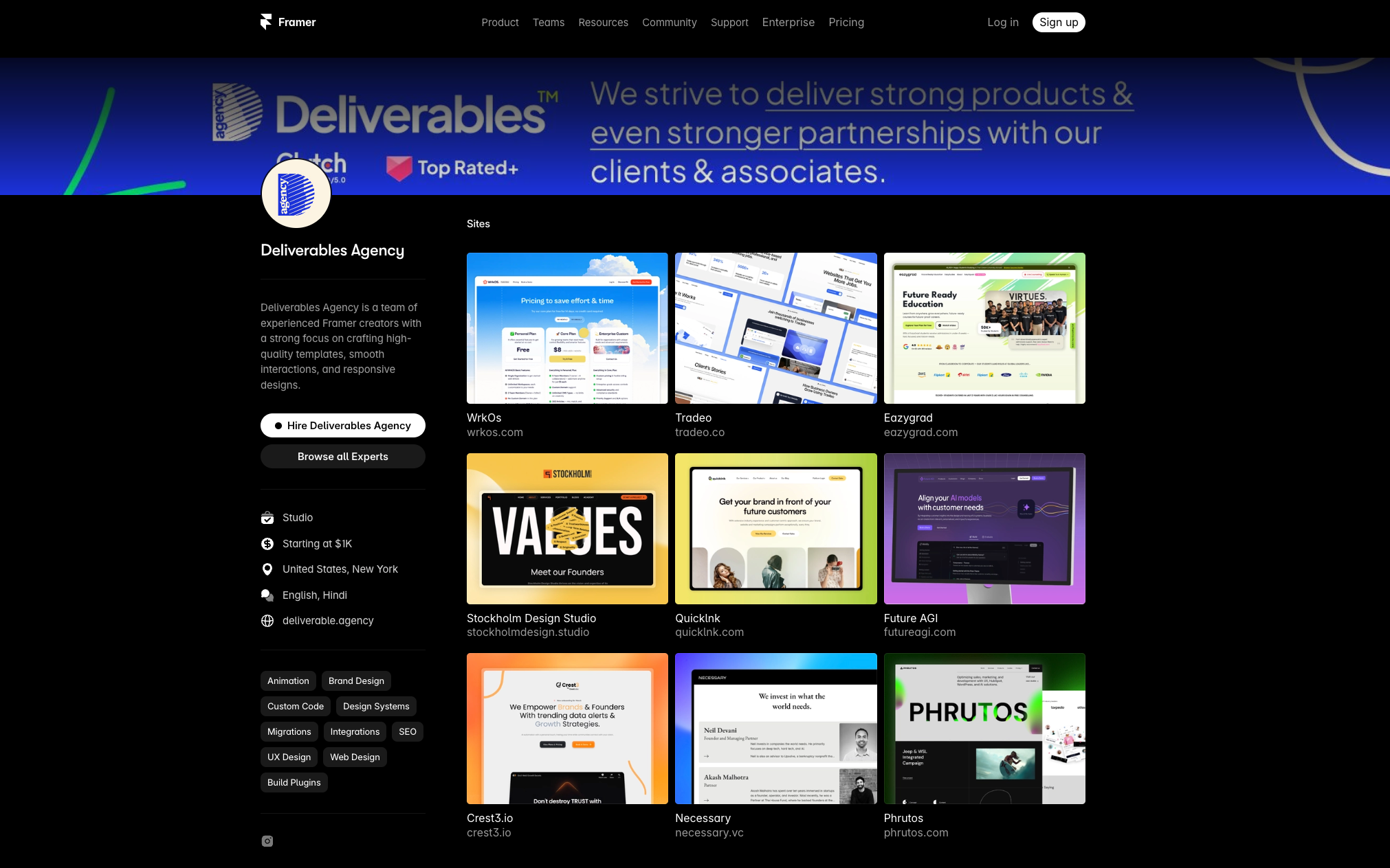 What sets Deliverables Agency apart from many studios with Expert status is the breadth of services they handle within a single engagement. Animation, custom code, design systems, SEO, migrations, and plugin builds are all documented capabilities. For most Framer projects, covering that ground typically requires coordinating multiple specialists. Having those skills in one agency reduces handoff errors and keeps the project consistent from brief to launch.